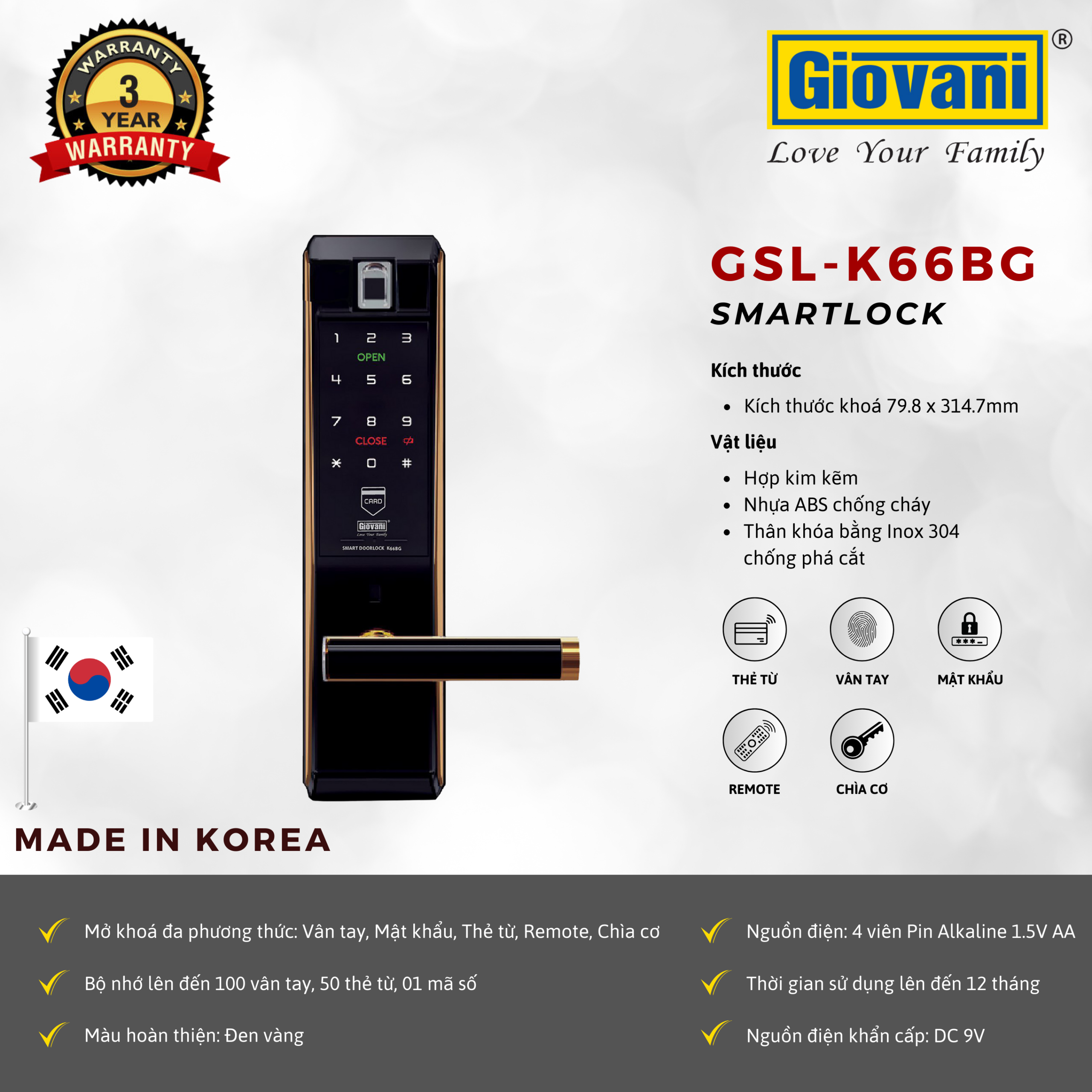 Khóa Cửa Gỗ Thông Minh Giovani GSL-K66BS/BG Made In Korea