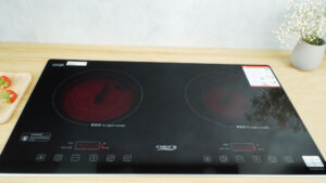 Bếp điện lắp ráp tại Việt Nam. Bảo hành 3 năm – 1 đổi 1 trong vòng 7 ngày. Mặt kính EuroKera đen sang trọng với bo viền nhôm bảo vệ mặt kính. Mâm nhiệt EGO Hi-light (Đức), Ø14/22cm, tích hợp phím chọn vòng nấuTự động chia sẻ công suất giữa 2 bếp, max 3200W – 3400W. Hẹn giờ độc lập cho từng vùng nấu, thời gian hẹn đến 8.00 giờ. Điều khiển công suất nhiều mức. Bàn phím siêu nhạy cả khi tay ướt.